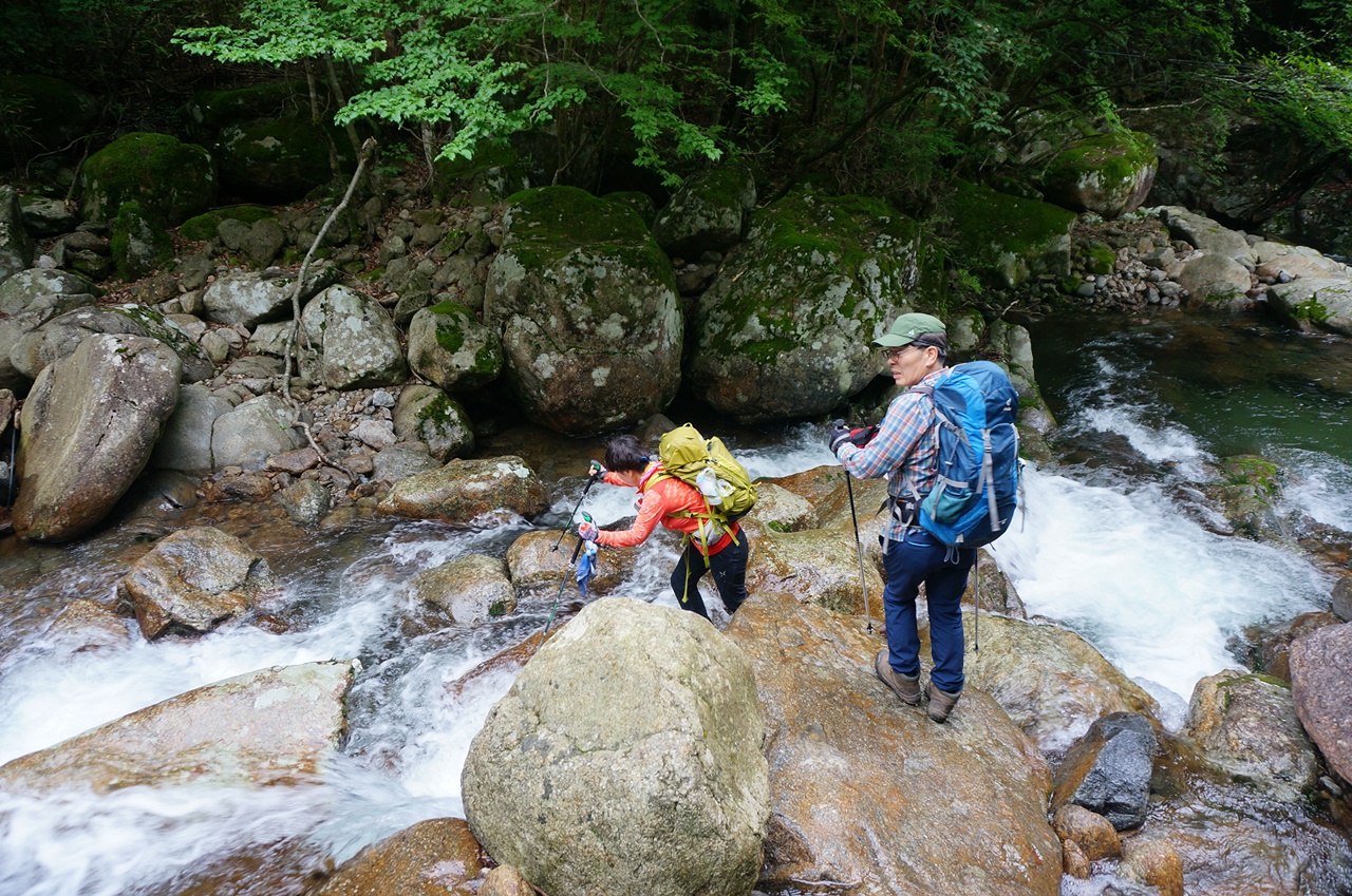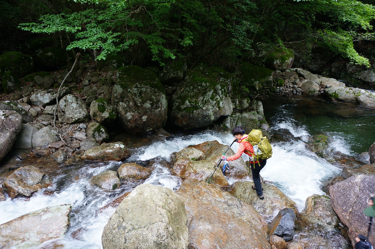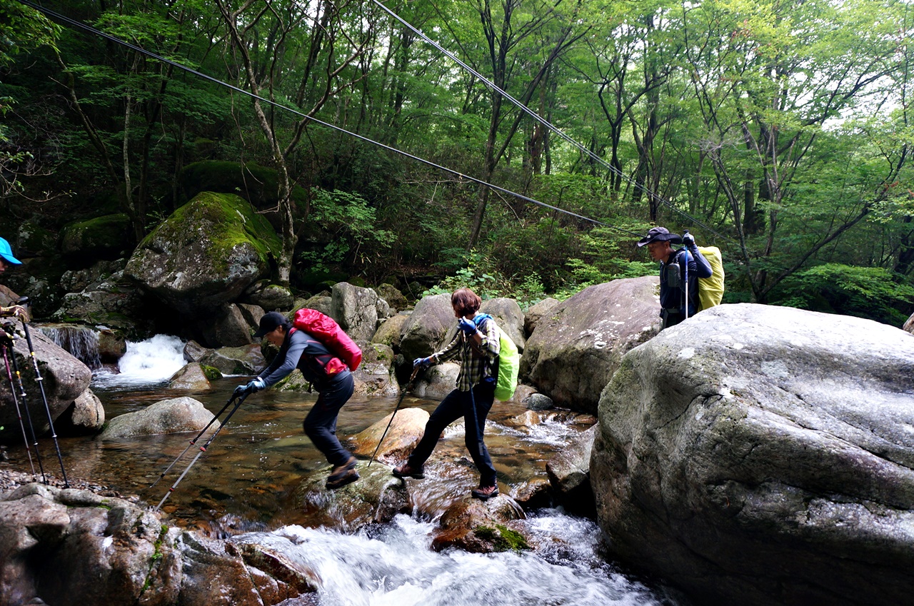 계곡을 건너야 하는 지점에서 불어난 물 때문에 이곳저곳을 살피다 등산화를 벗지 않고도 건널 수 있는 곳을 찾아