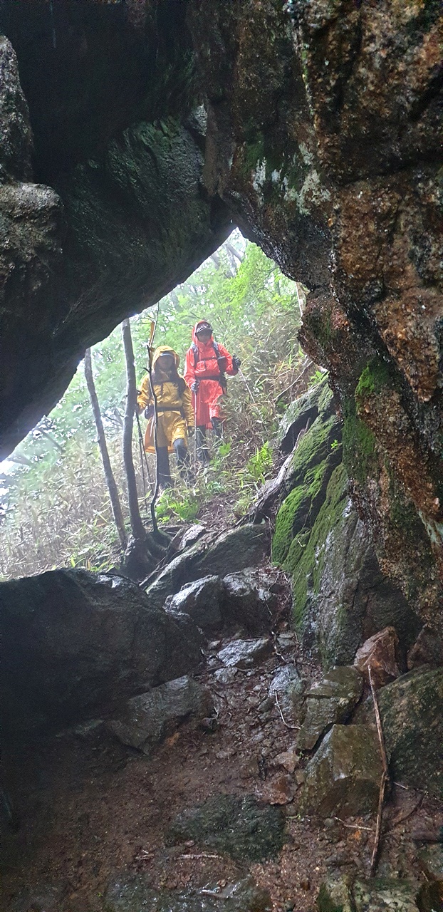 벼랑 끝 아슬아슬한 곳으로 길을 찾아 독바위에 바싹 붙어 통과하였다.