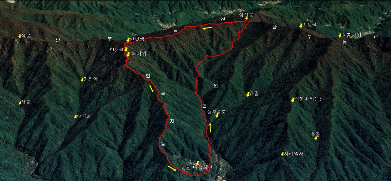 걸어간 길:단천마을-단천골 왼골-삼신봉-단천지능-단천마을