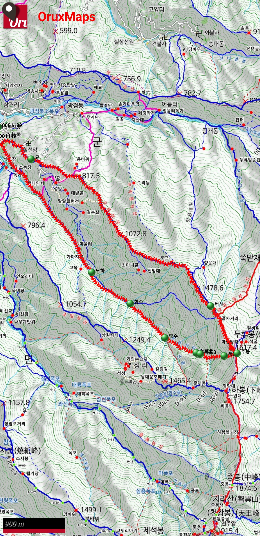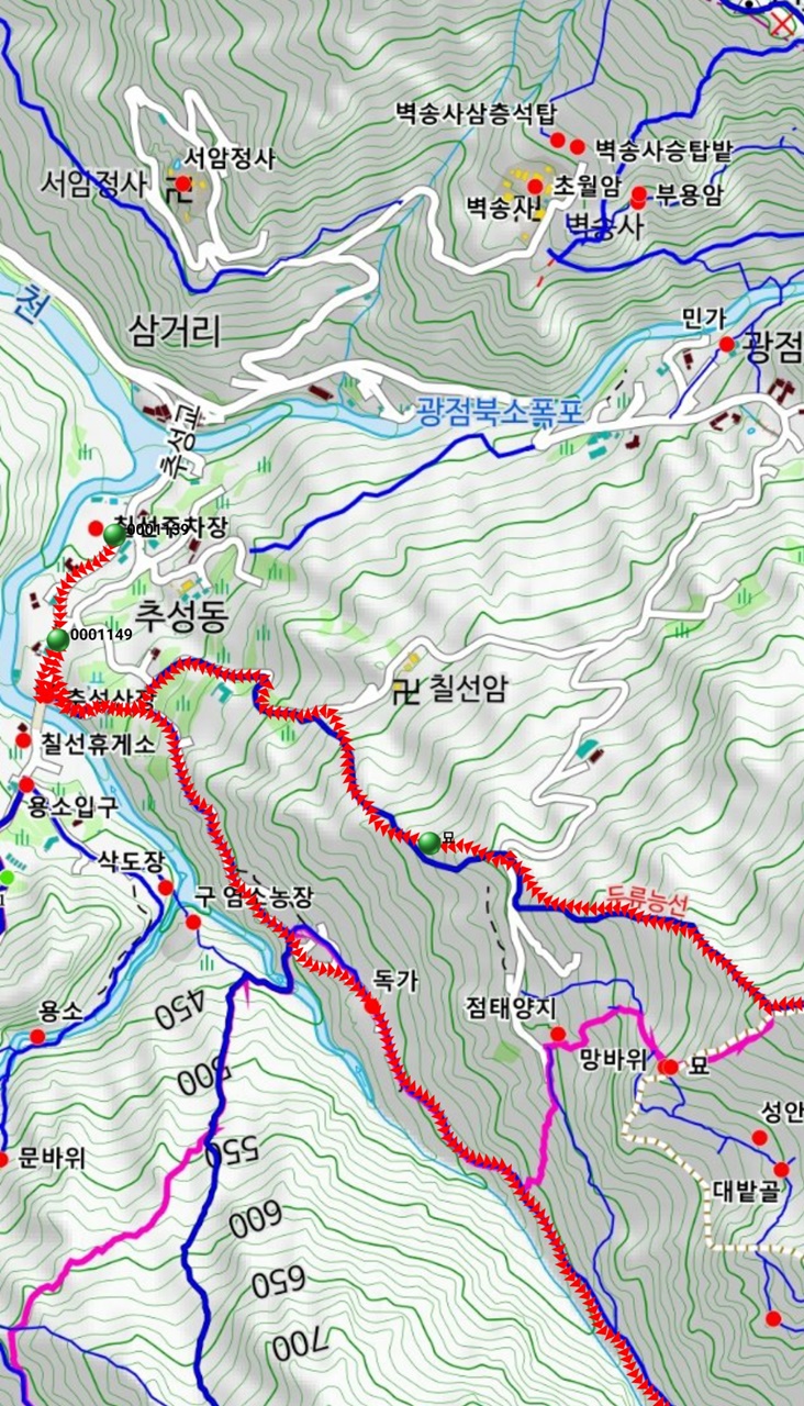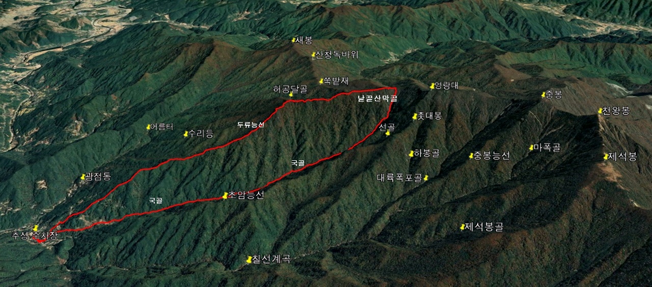 걸어간 길:추성산장-국골-날끝산막골-두류봉-국골사거리-두류능선-추성동