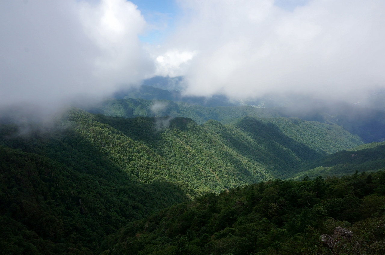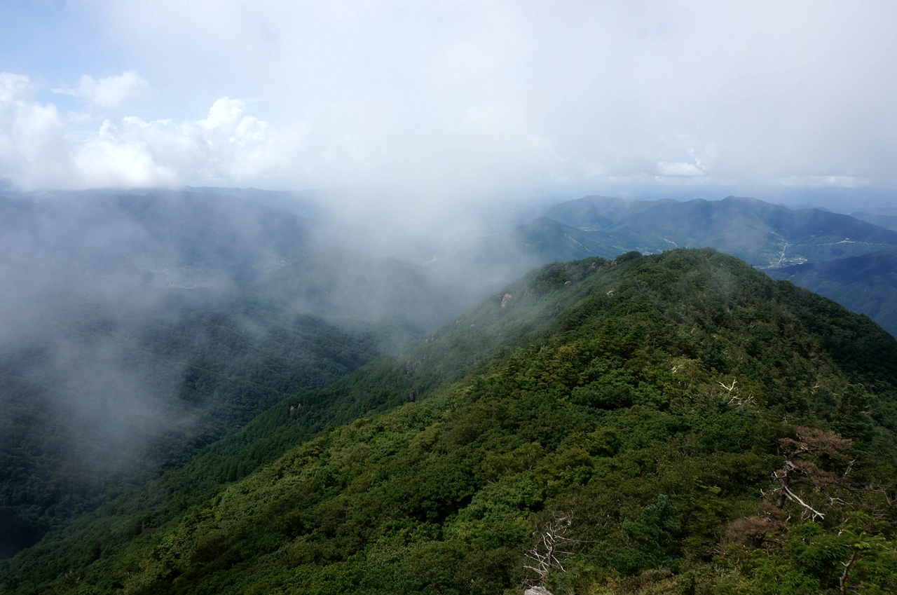 칠선계곡과 국골을 양편으로 가르는 초암 능선도 구름이 살짝 걸린 채 선명하였다.
