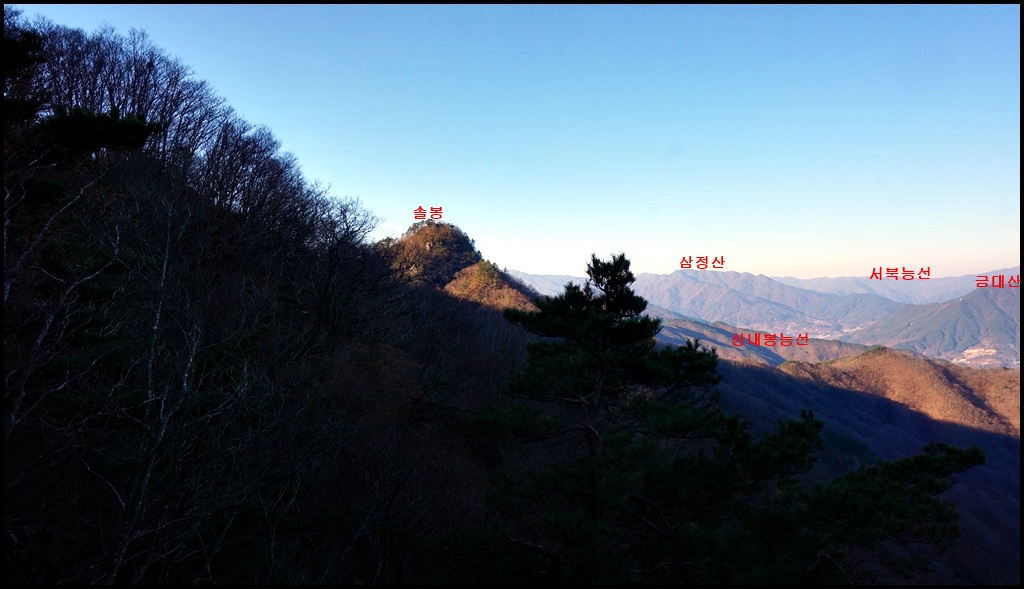 의론대에서 바라본 법화산 자락과 그 뒤 삼봉산, 음달골 좌우의 황새날등과 상대날등