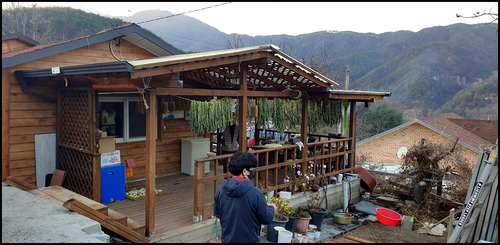 마지막 민가 작업장에는 이른 아침부터 감을 깎아 곶감을 만드는 작업이 한창 진행 중이었다.