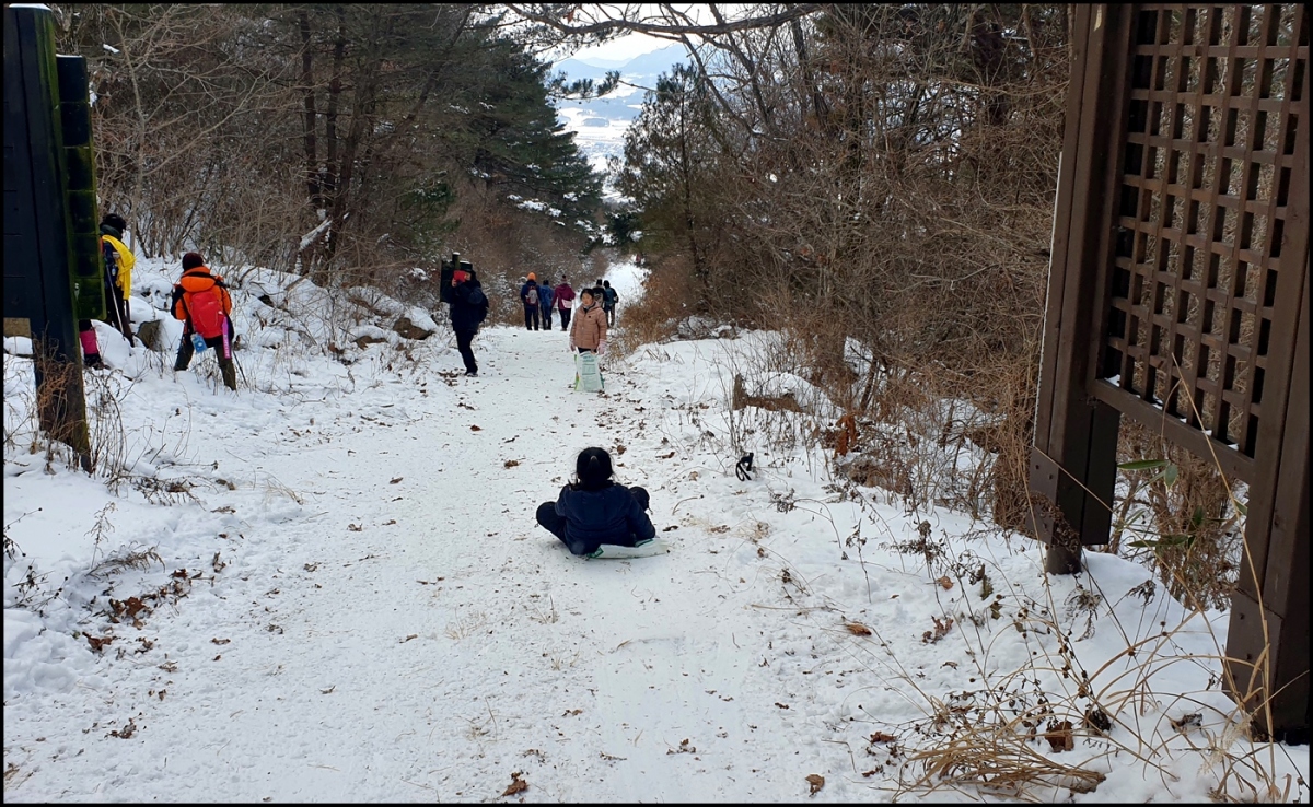 애들에게 비닐포대를 빌려 한 번씩 미끄럼을 탔다.