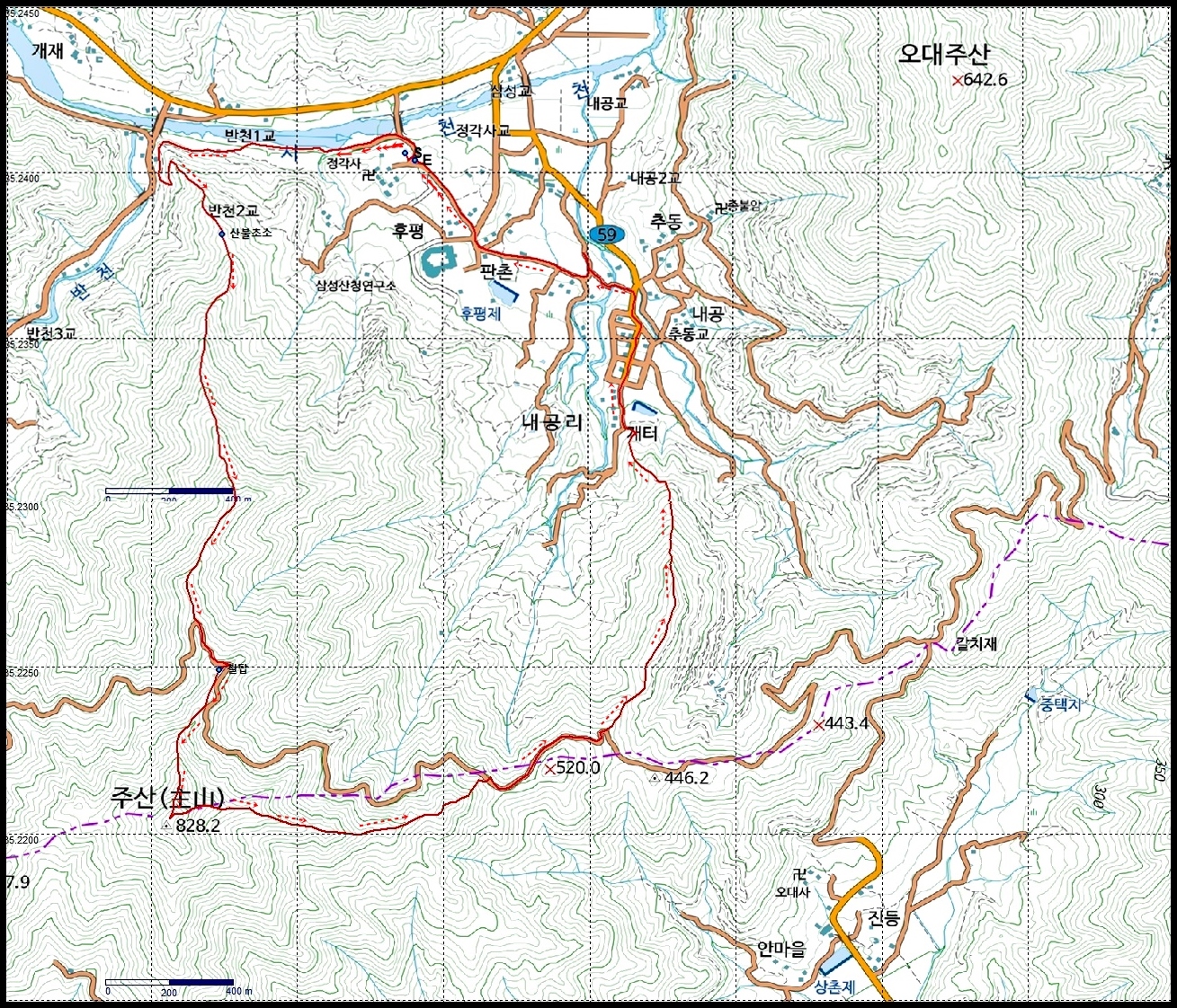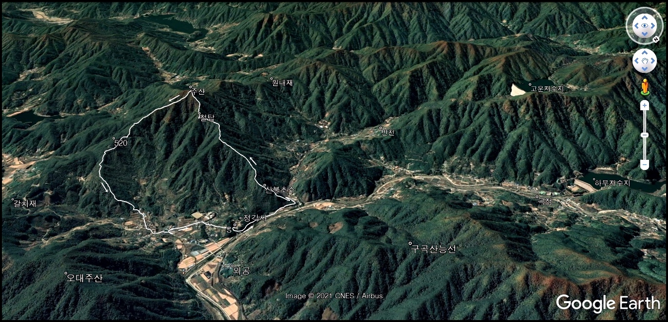 걸어간 길:산청군 시천면 내공리 정각사-반천1교 주산들머리-우량기-주산(828)-임도-개터-문화마을-판촌-정각사