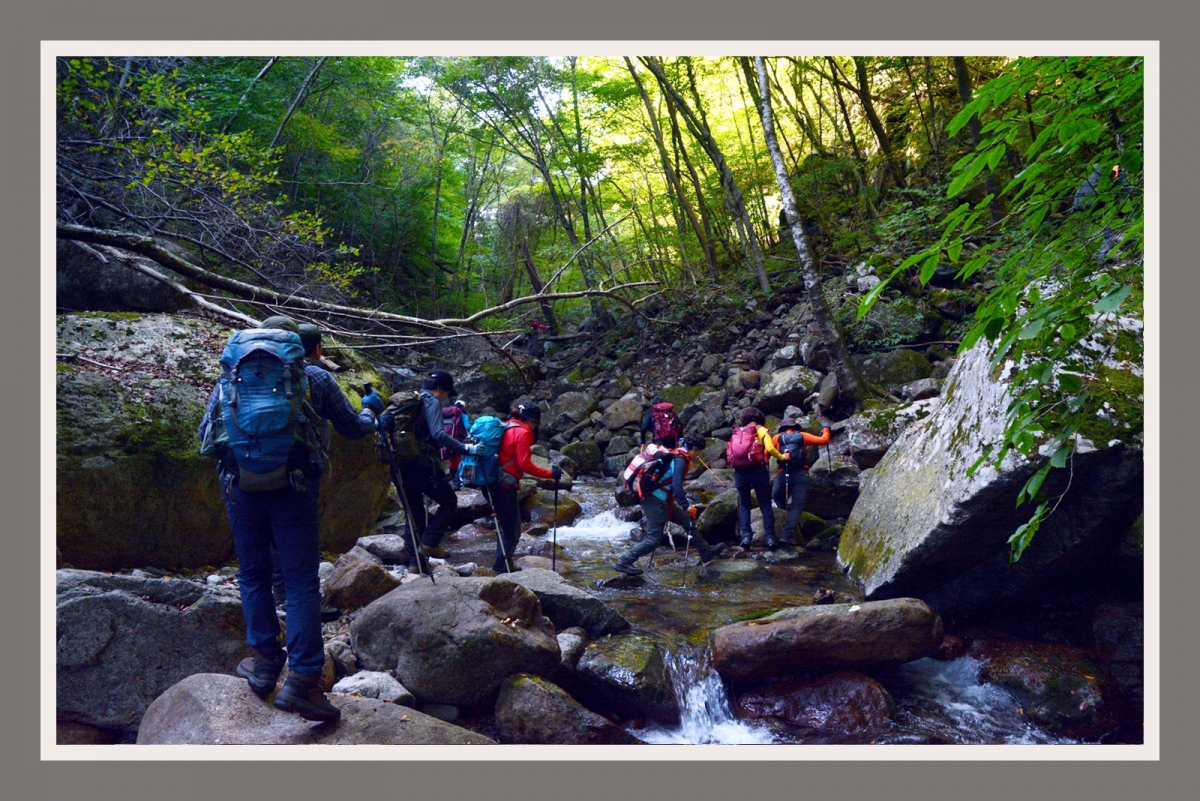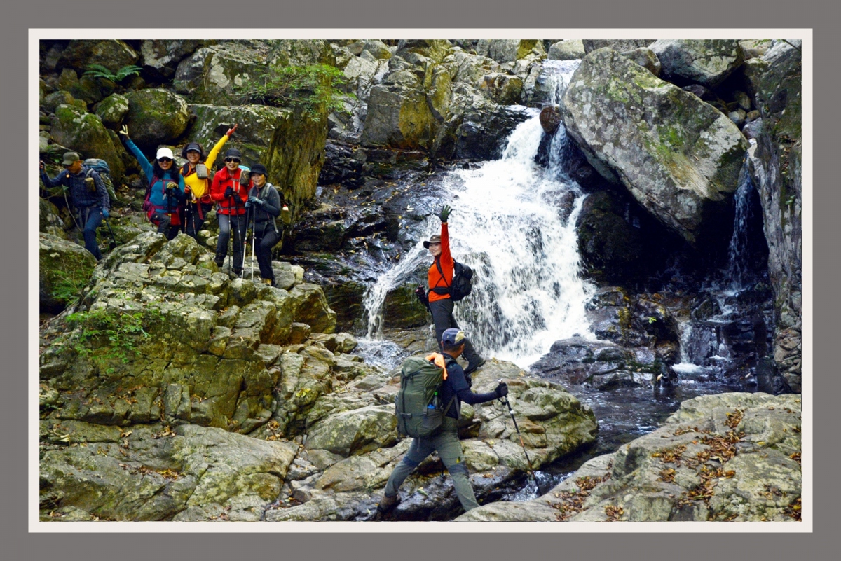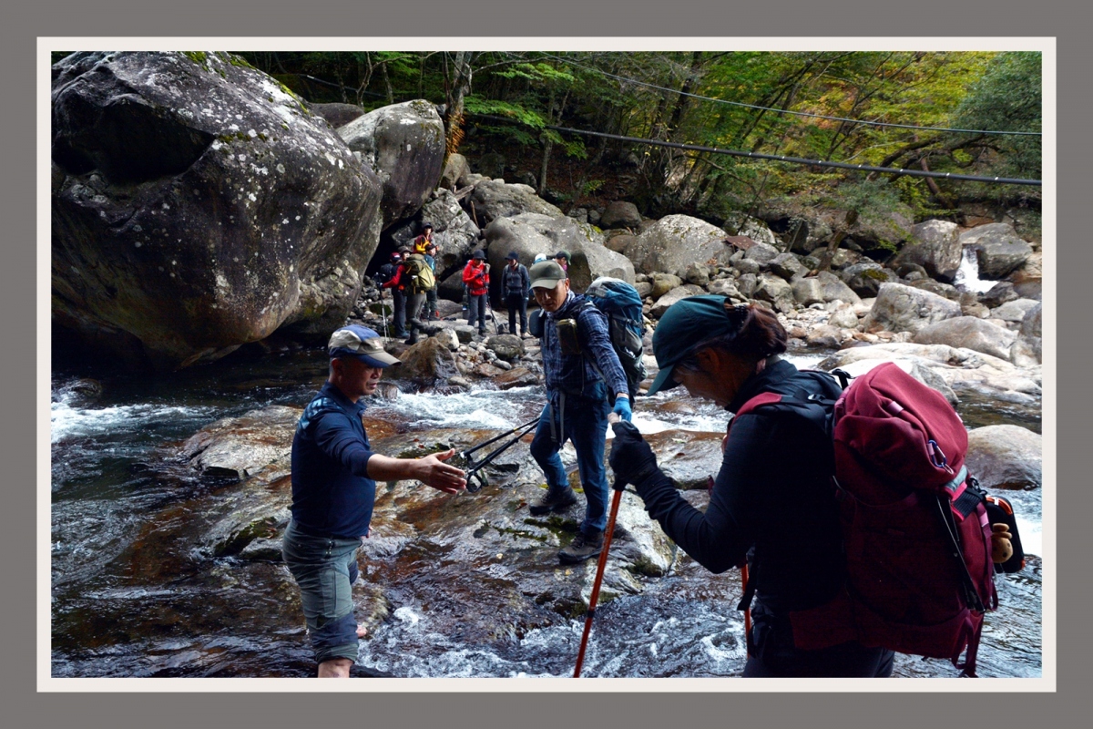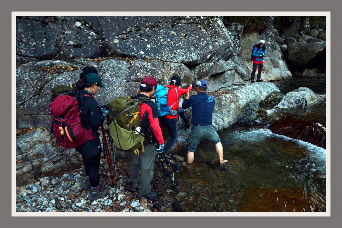 먼저 건너 간 순진 형이 등산화를 벗고 위태로운 구간에서 한 사람씩 건널 수 있도록 붙잡아 주었다.