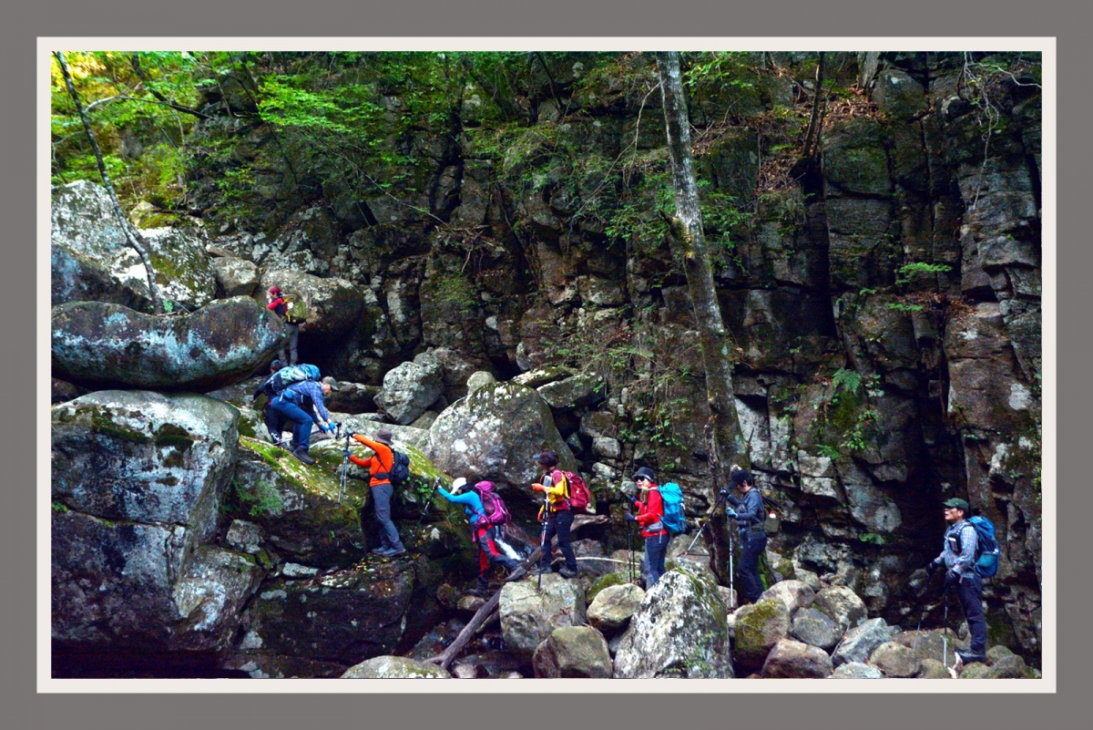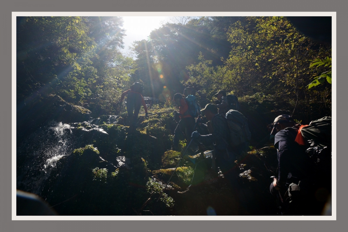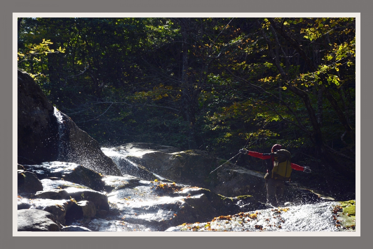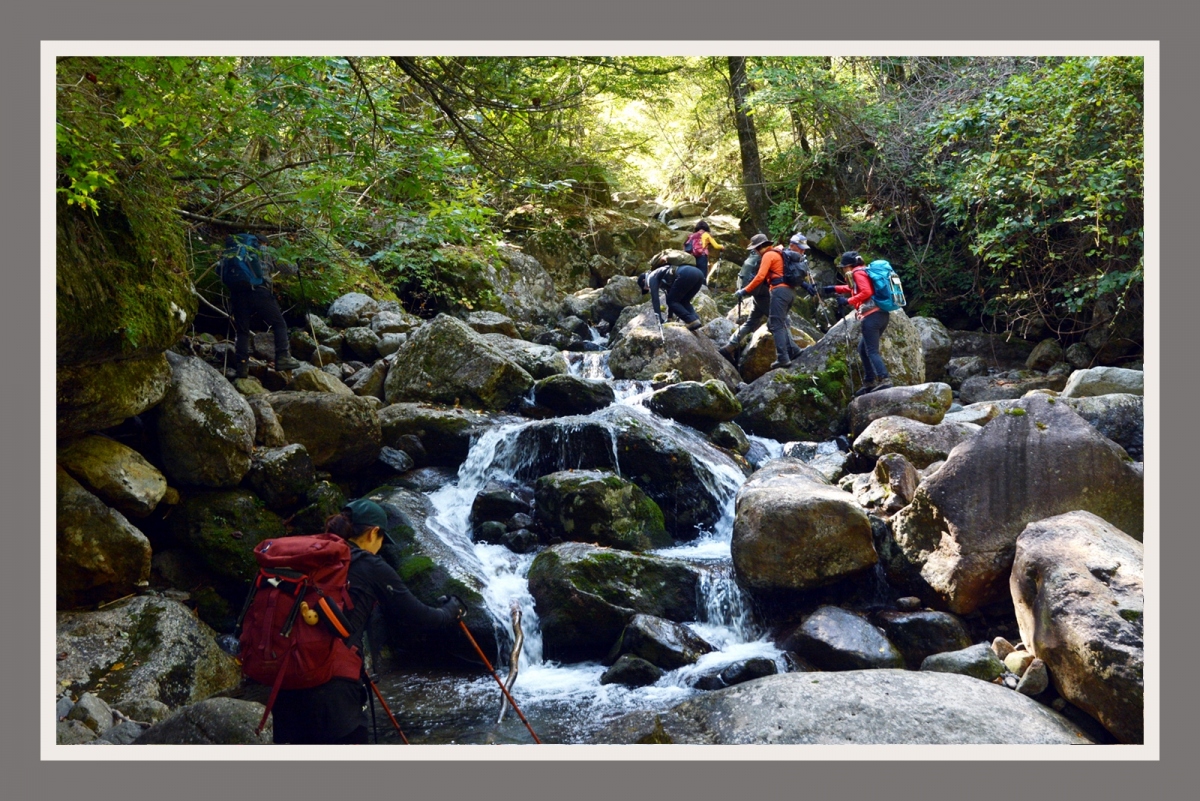 먼저 건너 간 순진 형이 등산화를 벗고 위태로운 구간에서 한 사람씩 건널 수 있도록 붙잡아 주었다.