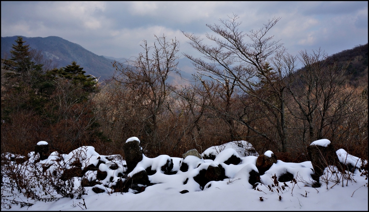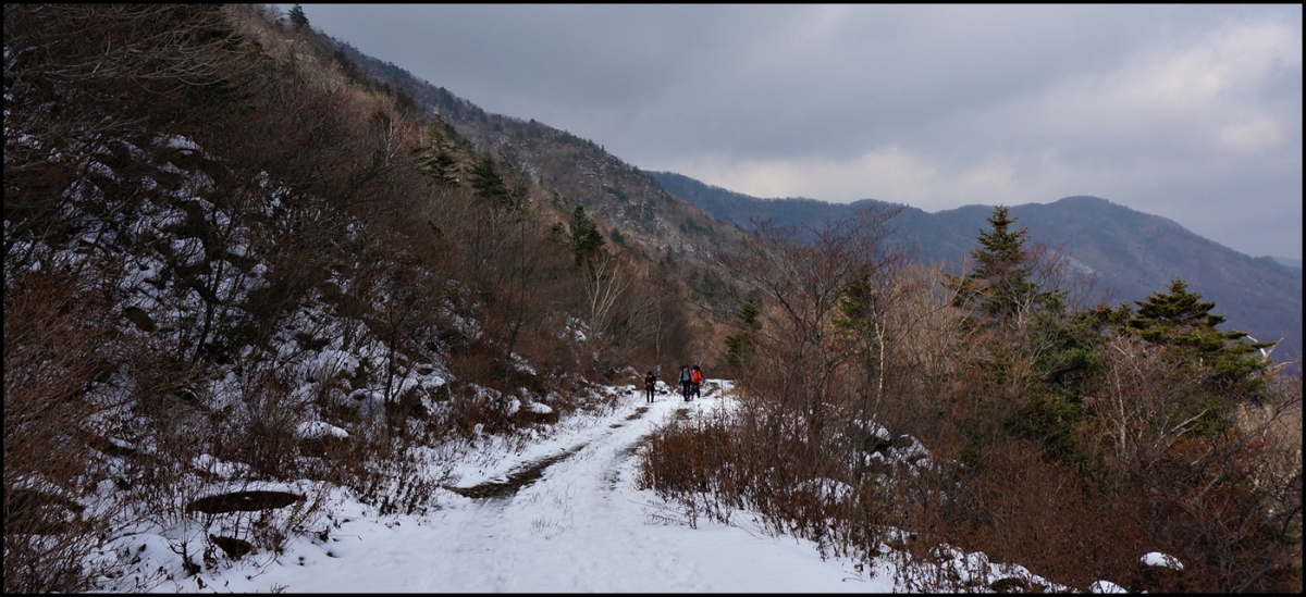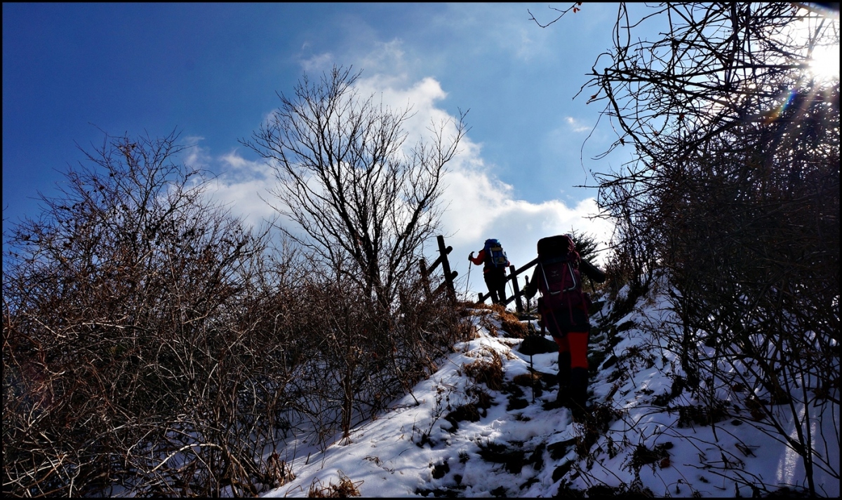 산의 아랫도리는 아직 가을을 벗어나지 않았는데, 위쪽은 겨울이 폭삭 내려앉은 기이함으로 오히려 모두의 마음을 들뜨게 했다.