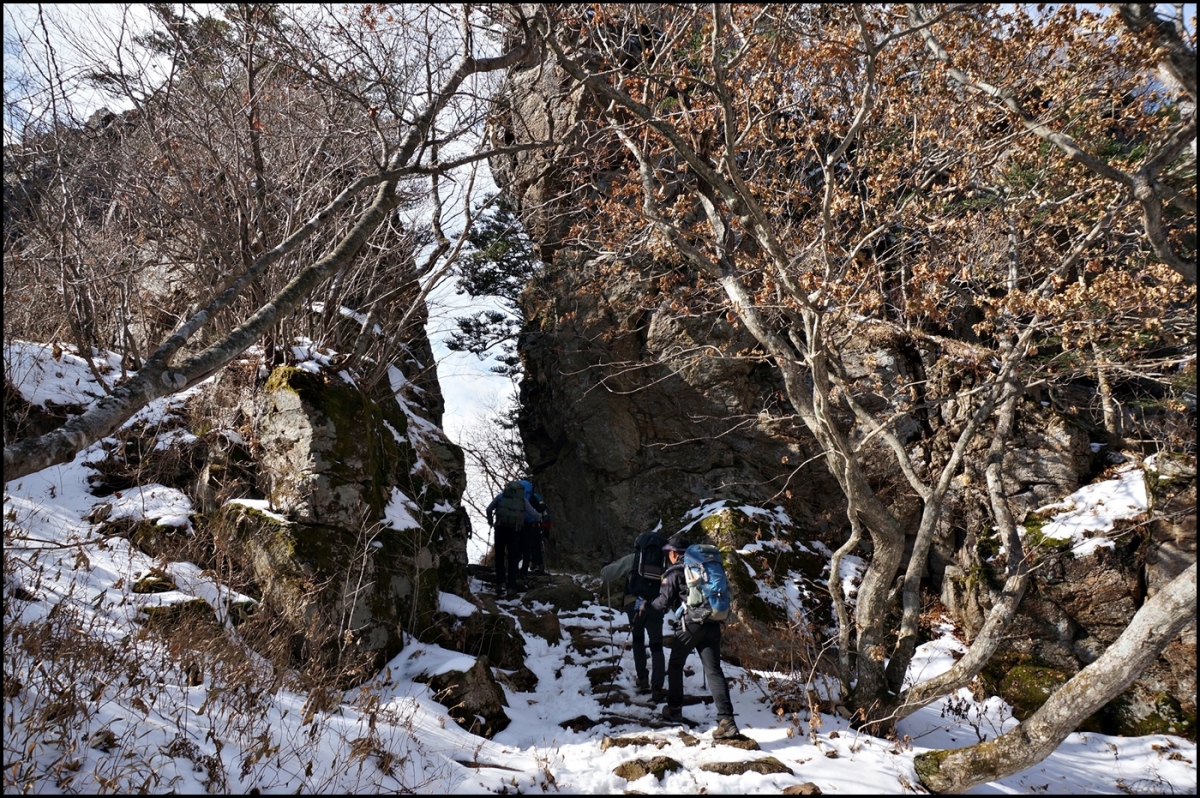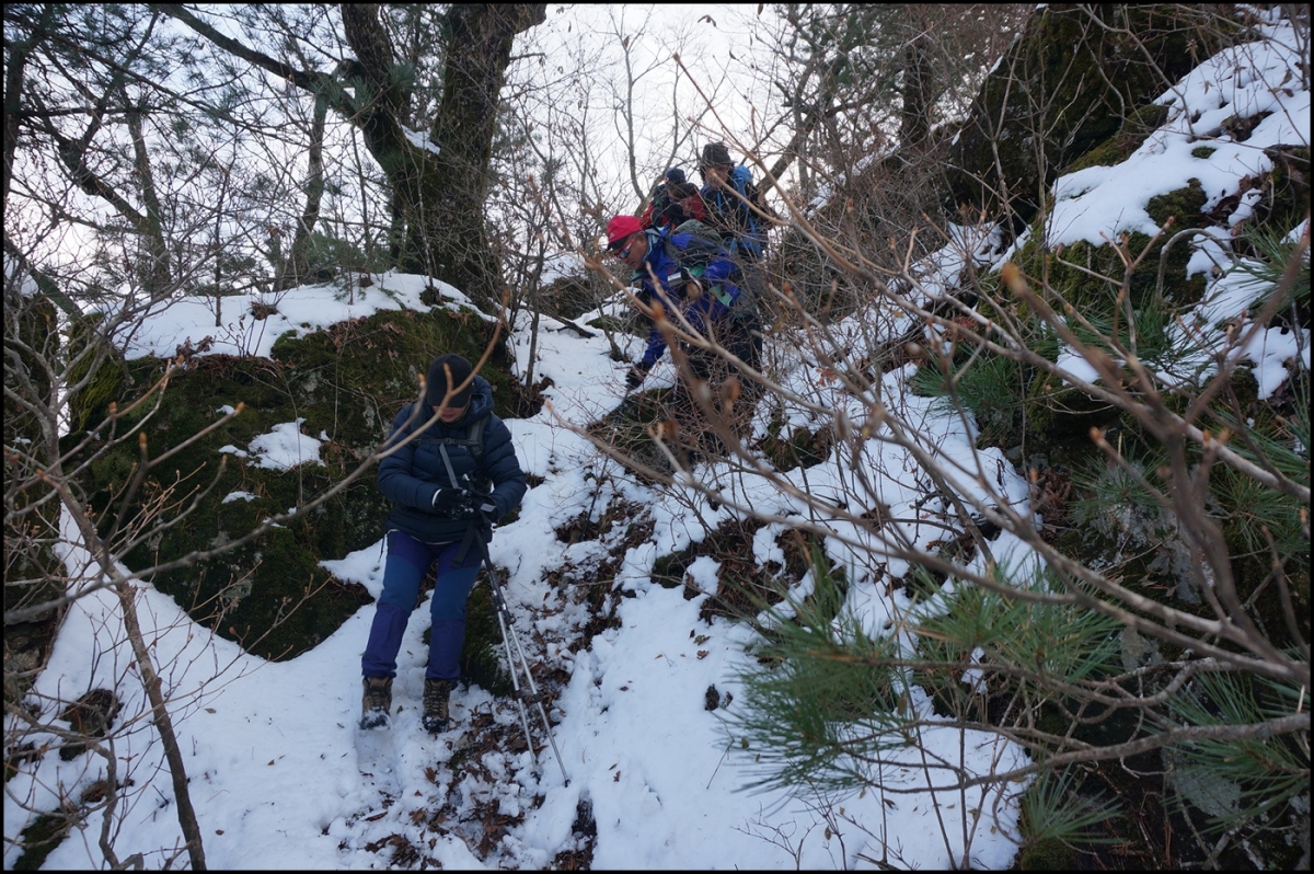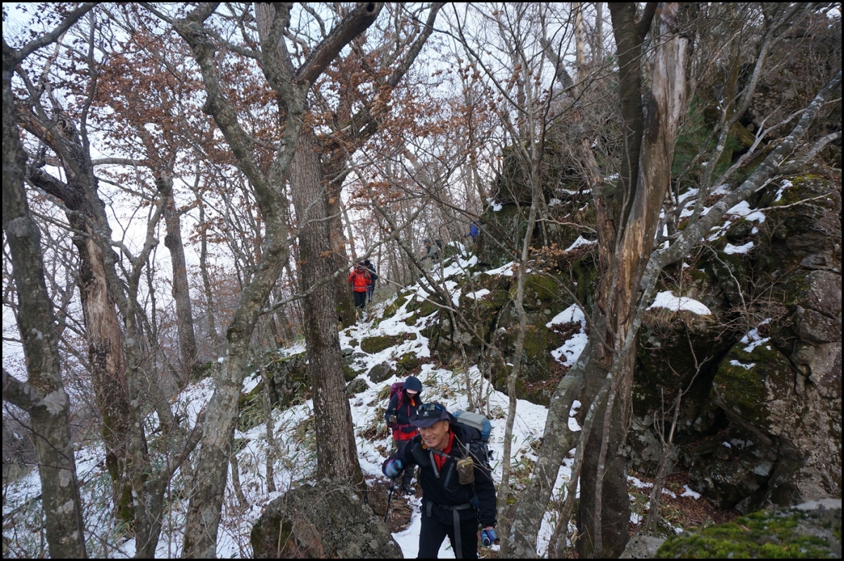 맨 앞에서 뒷사람들이 로프를 잡고 발 디딜 공간이 미끄럽지 않도록 영구 형님은 손으로 낙엽을 쓸고 눈을 치우느라 손이 꽁꽁 얼어 호호 불었다.