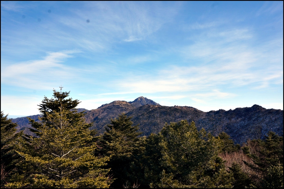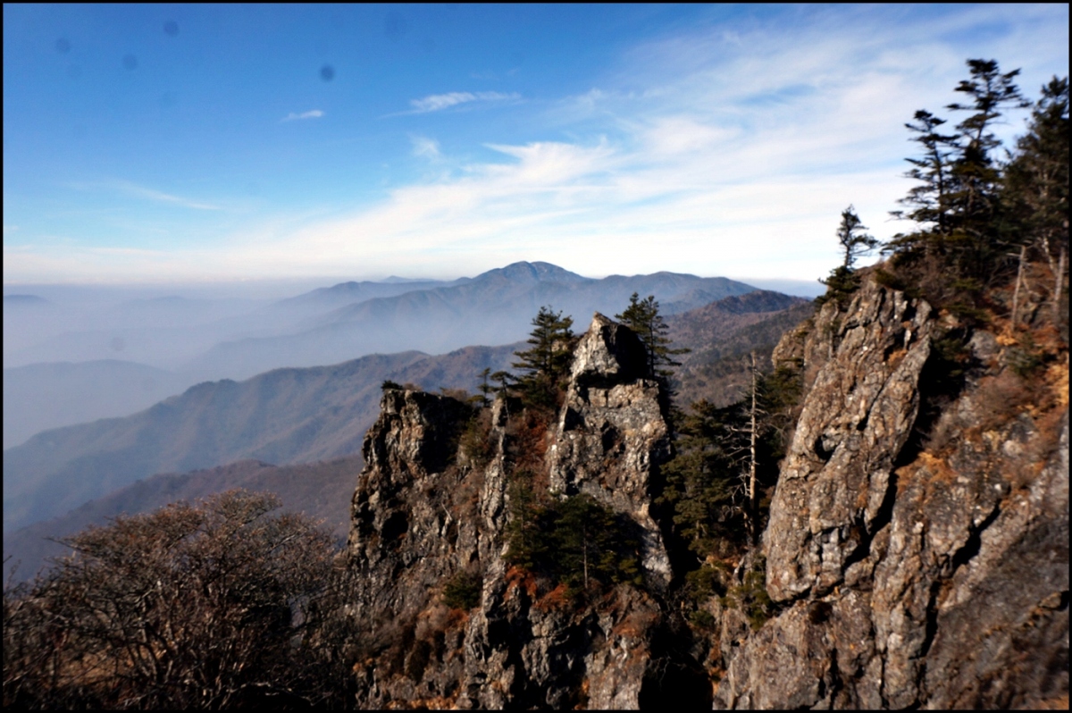 조망터에서 바라다 보이는 남부 능선은 가운데 삼신봉을 중심으로 오른쪽으로 지난번 남북 종주 때 지나온 내삼신봉과