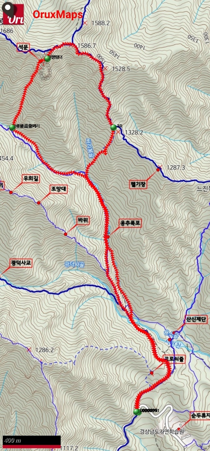 걸어간 길:환경교육원-중봉 골-석문 골-석문-1586봉-황금 능선-중봉 골 3거리-중봉 골-천왕 동능-교육원