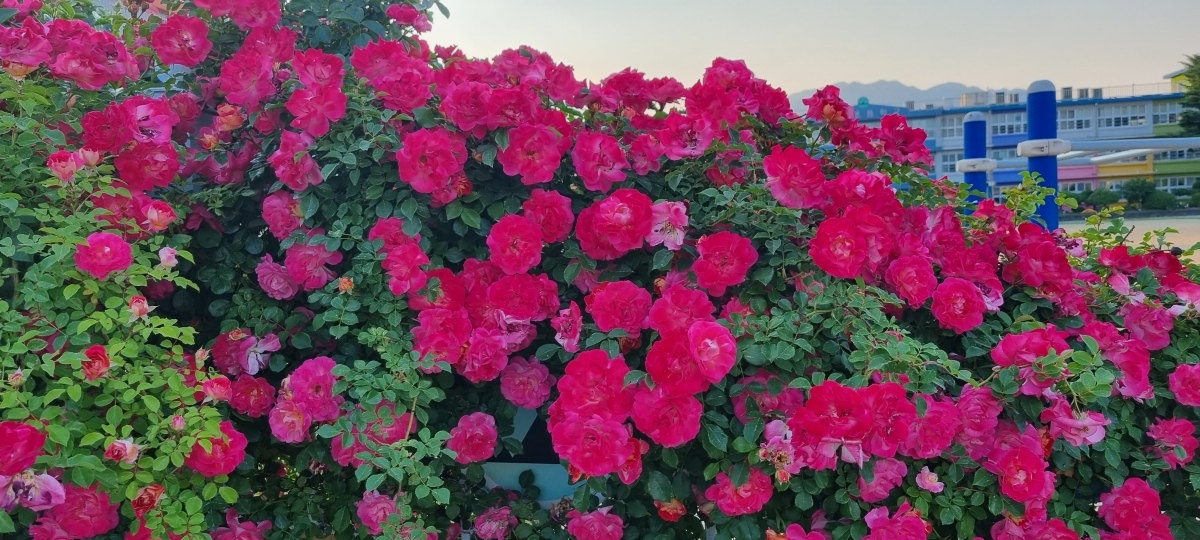 주차장에 장미꽃이 만발하여 핸드폰을 꺼냈다.