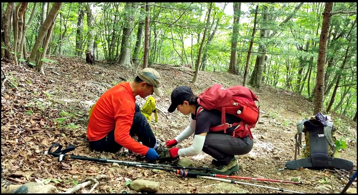 밑 창이 입을 벌려버린 팀장의 등산화를 봄이 님이 묶어주었다.