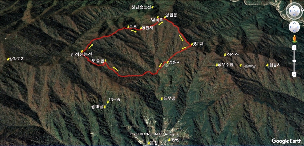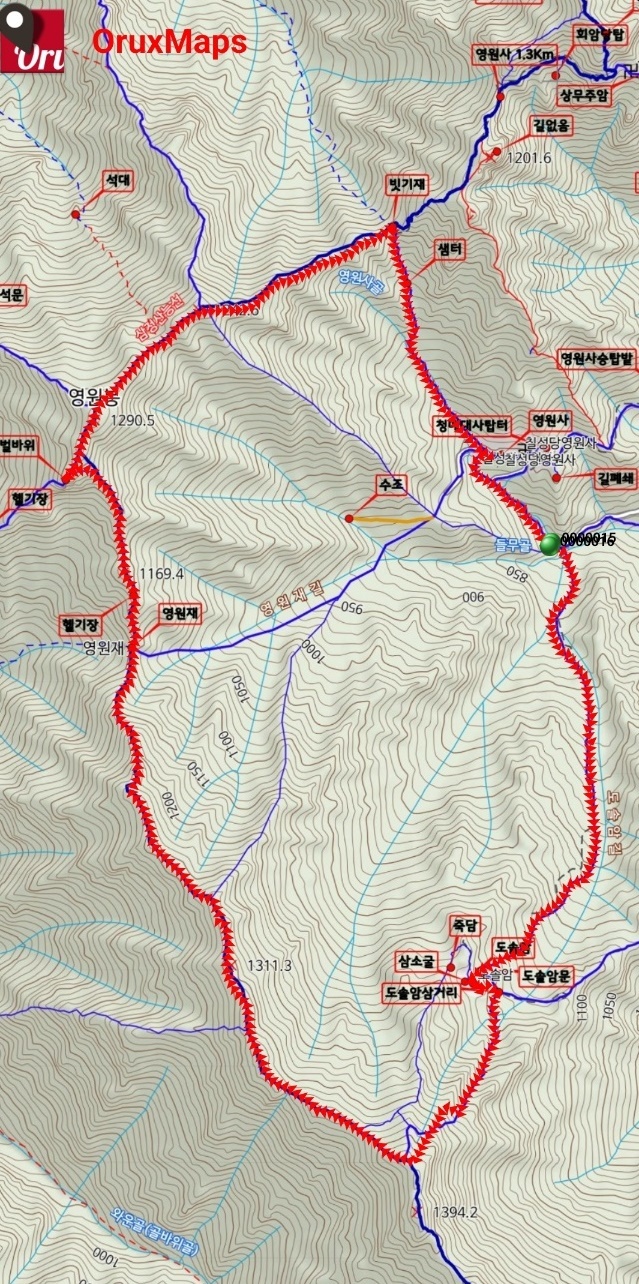 걸어간 길:영원사-도솔암-삼정산능선-영원재-벌바위-영원봉-빗기재-영원사