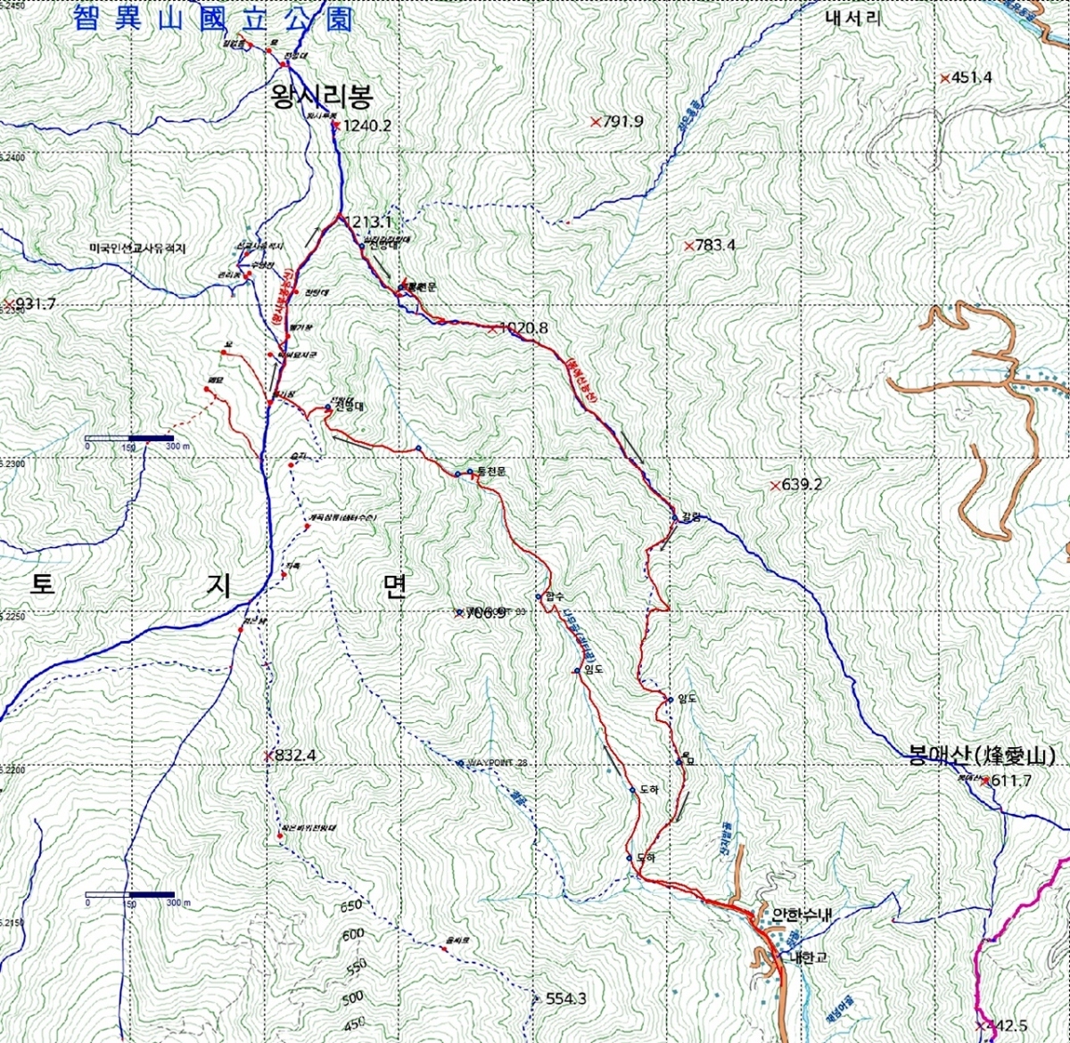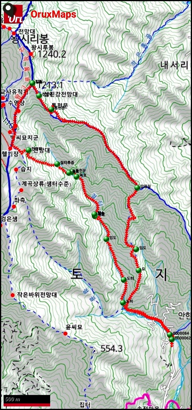 폭포-전망대-왕시루봉 능선-봉애산 능선-통천문-절터골 갈림-안한수내