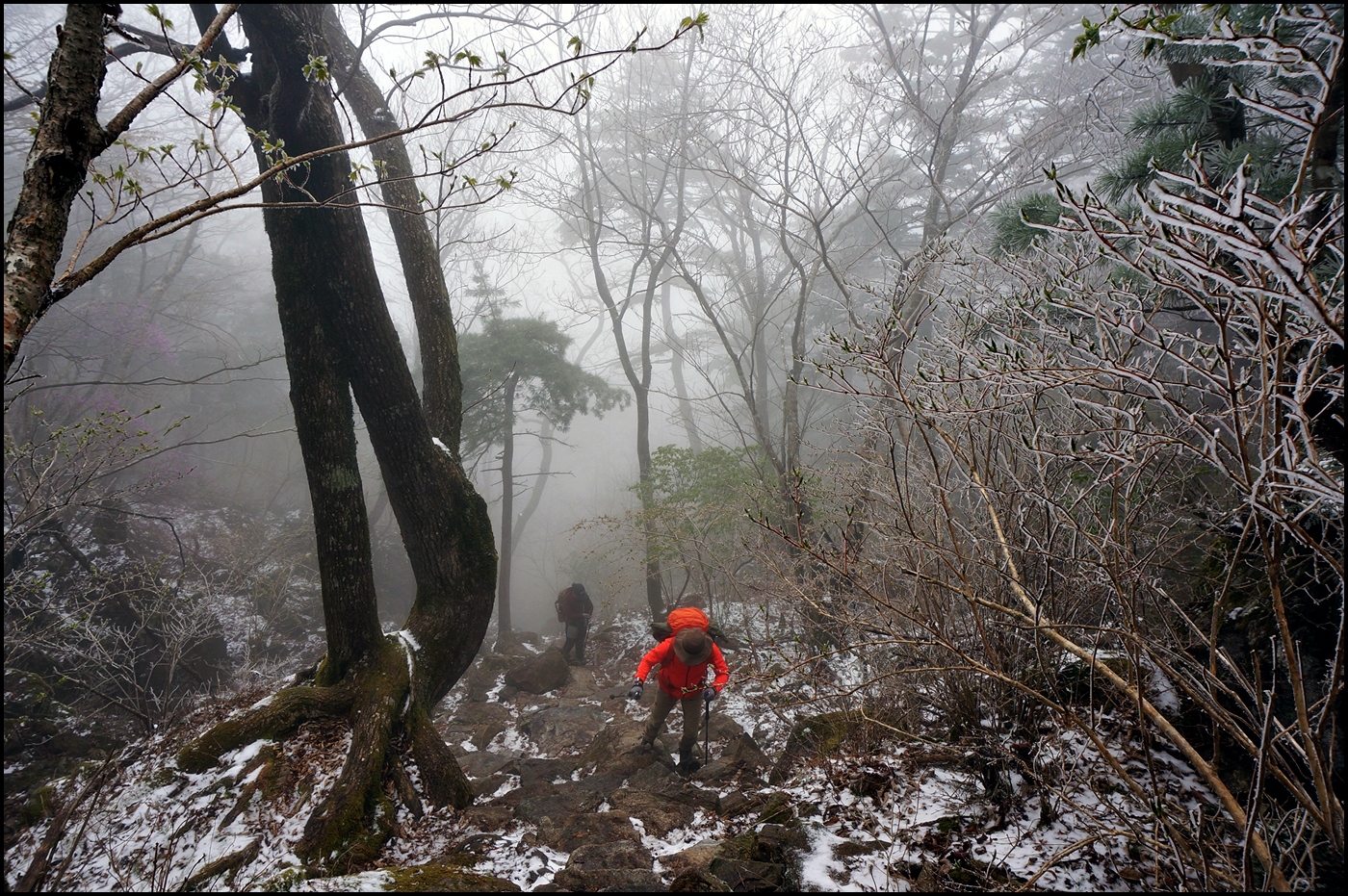 천왕봉 넘어 동부 능선으로는 봄볕이 더디게 스며들었다.