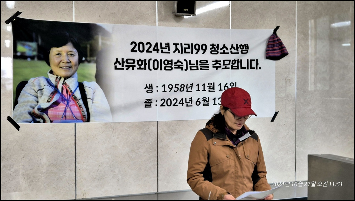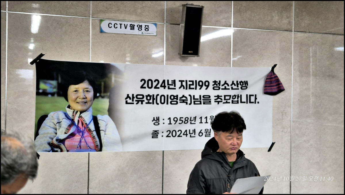 대피소 취사장으로 들어 서자 산유화 님 추모 현수막이 걸려있습니다.